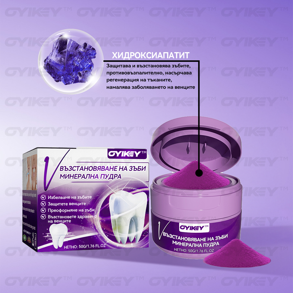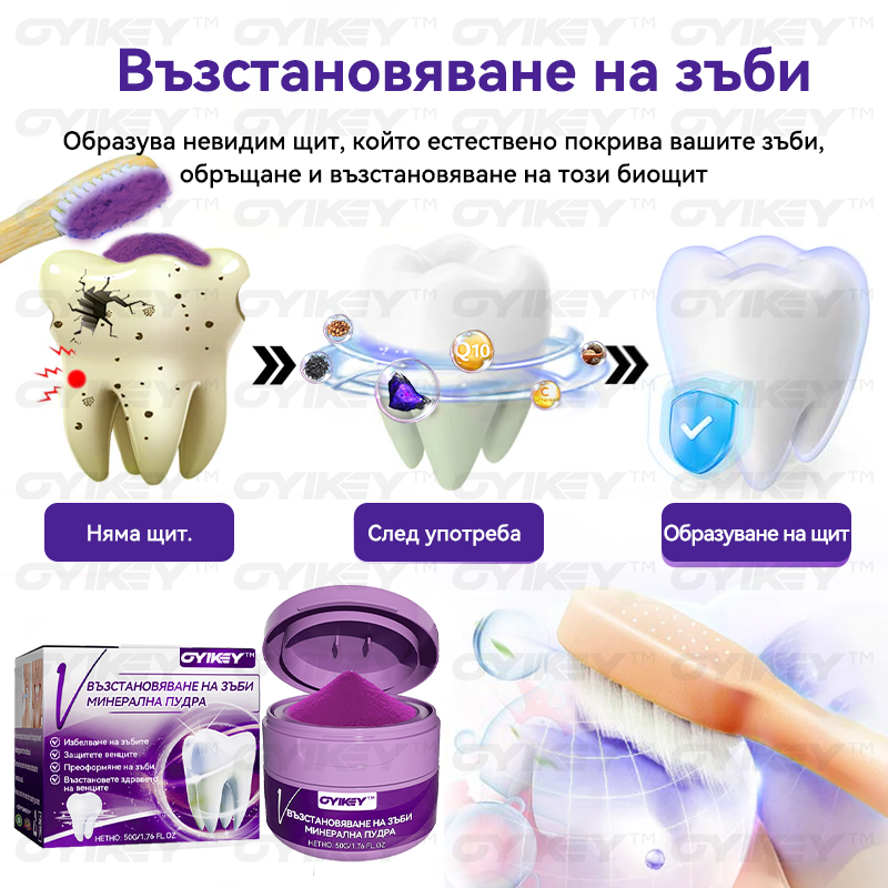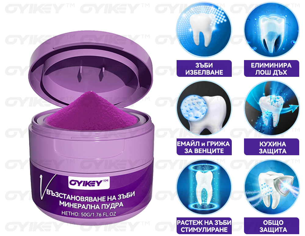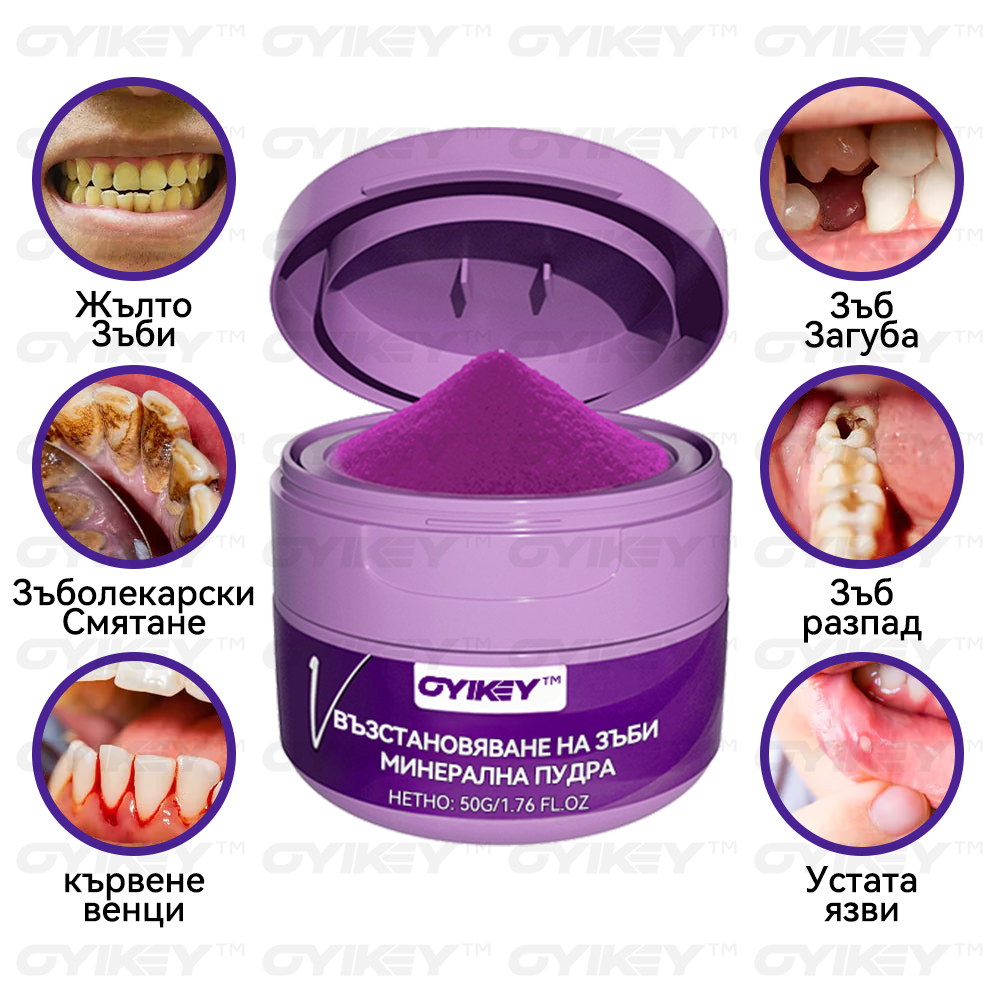 𝑂𝑦𝑖𝑘𝑒𝑦™ Възстановяване На Зъби Минерална Пудра елиминира 99,99% от бактериите, премахва лошия дъх, премахва плаката и зъбния камък, лекува гингивит и пародонтит, облекчава зъбобол, предотвратява и лекува кариес, възстановява зъбния емайл, стимулира репаративното образуване на дентин и подпомага регенерацията на загубени зъби.