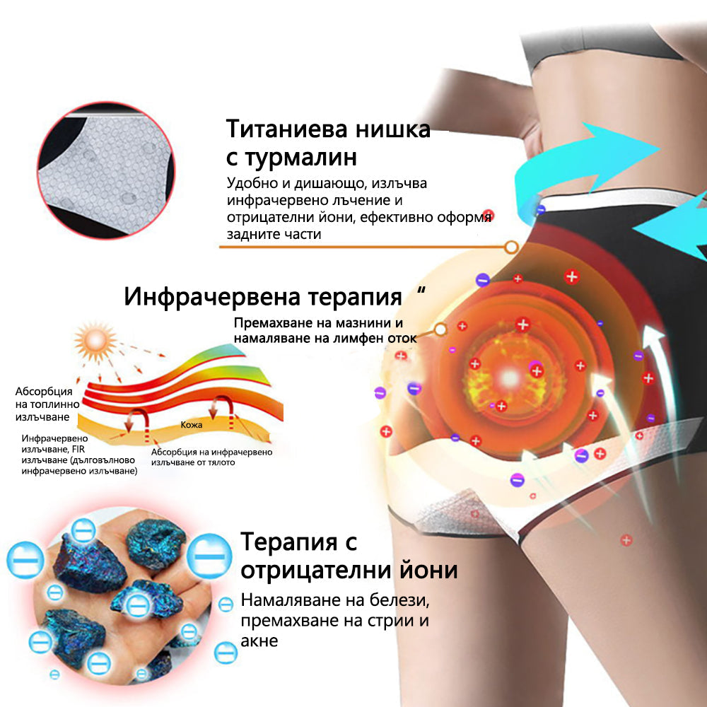 Sfrcord™ самонагряващи се турмалинови шорти от титаниеви влакна подобряват кръвообращението. намаляване на възпалението . и ускоряване на метаболизма на мазнините с помощта на инфрачервени лъчи . Титаниеви влакна освобождават отрицателни йони за подпомагане на детоксикацията и регенерацията на клетките . разтвор за натрупване на мазнини . лимфедем . разширени вени . белези . стрии . акне . и гинекологични опасения относно цялостната здравна поддръжка .