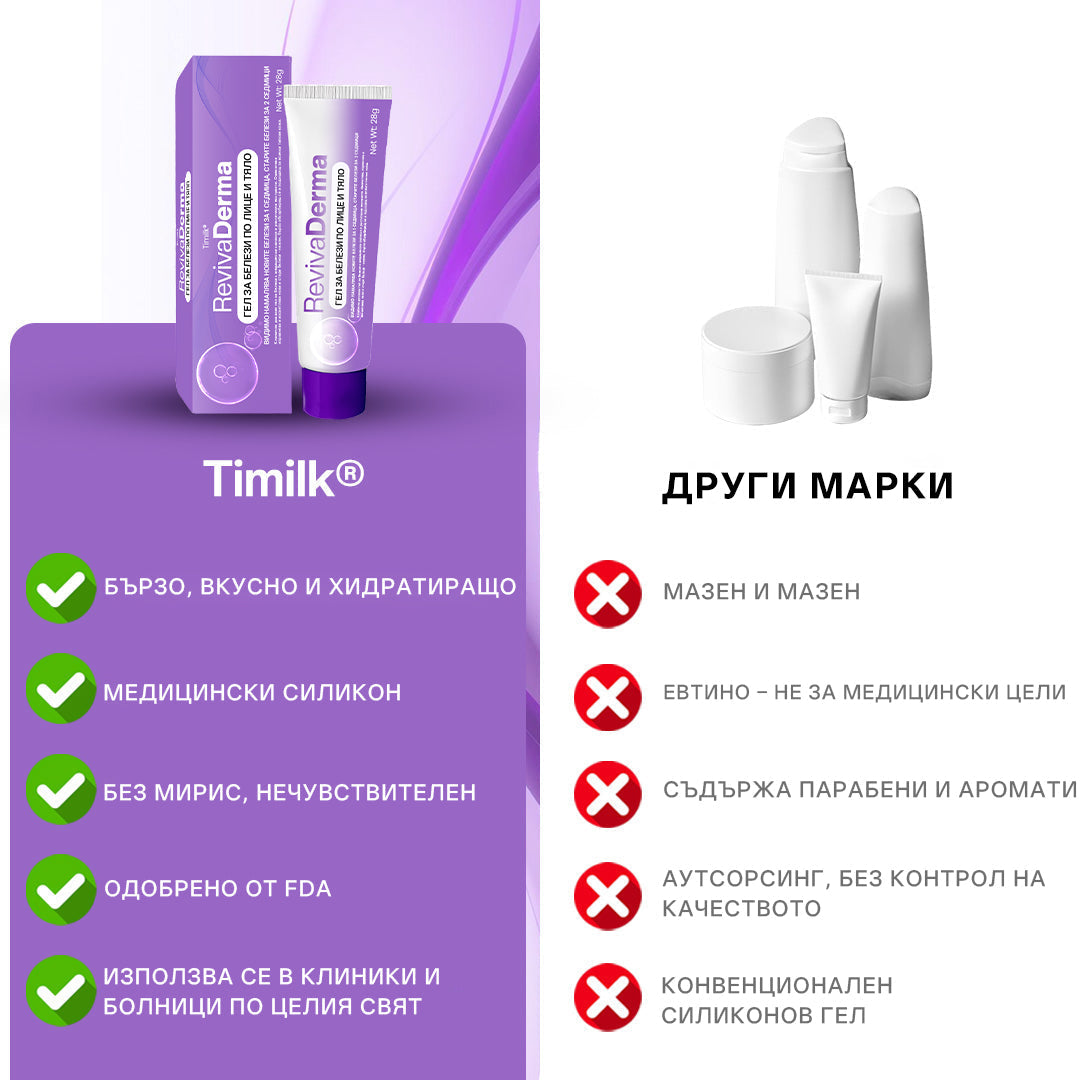 „След операцията останах с дълъг червен белег на ръката си. Приятел ми препоръча Timilk® RevivaDerma и много се радвам, че го пробвах. В рамките на месец белегът започна да изсветлява и текстурата му се подобри значително. Вече не се усеща стягане или сърбеж и е много по-малко видим от преди. Харесва ми колко е нежен гелът и колко бързо попива - никакво дразнене.“
